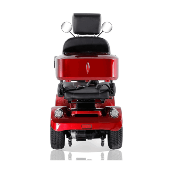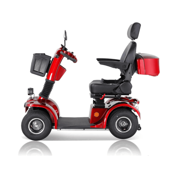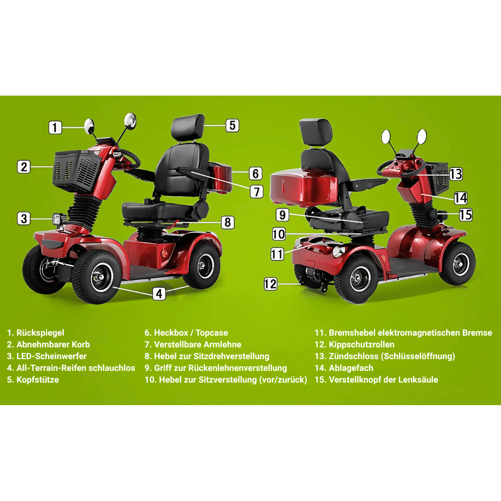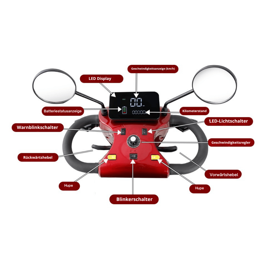 Für maximalen Komfort sorgen drehbarer Kapitänssitz, verstellbare Armlehnen und eine ergonomische Sitzposition. Die elektromagnetische Bremse hält zuverlässig an, Kippschutzrollen erhöhen die Stabilität. LED-Scheinwerfer, Blinker & Warnblinker verbessern die Sichtbarkeit – bei Tag und Nacht. Praktisch: Frontkorb & Topcase bieten Stauraum für Einkäufe und Alltagsgegenstände.